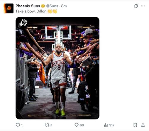 太阳官方晒出狄龙进入球员更衣室的图片,很多的球迷都来跟他击掌,太阳官方也为狄龙鼓掌。(狄龙是去年夏天在杜兰特的交易中来到的凤凰城,没想到他在这里打出了生涯最高光的赛季)